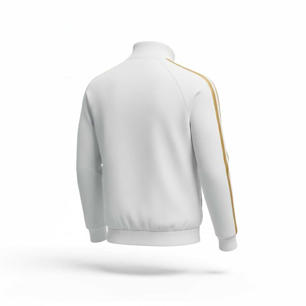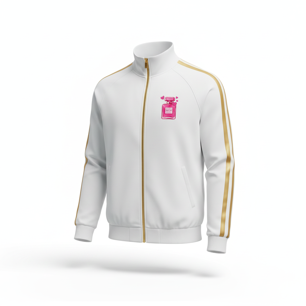 SWEET LOVE | Jaket Tracktop Putih Garis Emas. Tampil manis sekaligus sporty dengan jaket tracktop putih bersih ini! Jaket ini dihiasi dengan aksen garis emas di kedua lengan yang memberikan kesan mewah dan ritsleting emas yang serasi. Ditambah lagi, graphic botol parfum pink dengan tulisan “Sweet Love” di dada kiri menambah sentuhan feminin dan unik. Dibuat dari bahan yang nyaman, jaket pre-loved ini sempurna untuk hangout kasual, athleisure look, atau sebagai statement piece yang memancarkan pesona ceria.